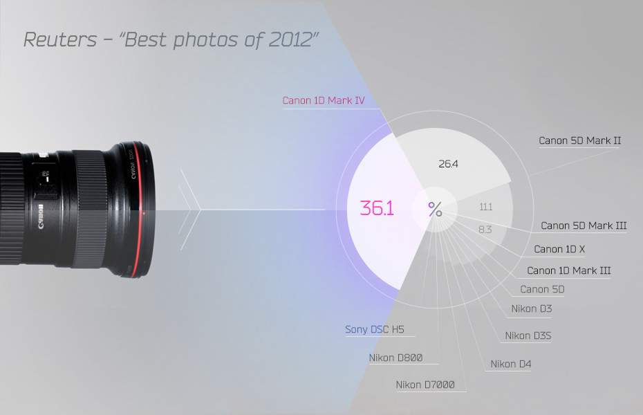 If you have ever wondered which camera models are used by pro photographers, here is an interesting figure for you. Just recently news agency Reuters published the ranking of their “2012 photos of the year”. Along with the images comes EXIF data like camera model, lens, shutter speed etc.